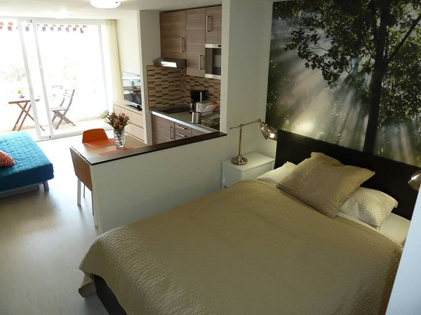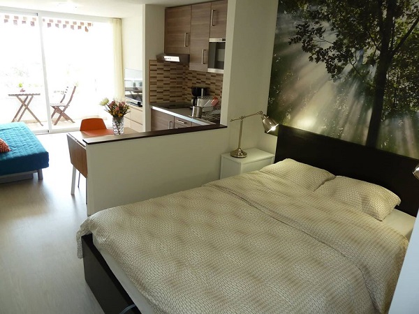 The chic living room has a nice sofa bed for 2 persons and a flat-screen TV, the bedroom is with a comfortable double bed. The kitchen equipped with oven, refrigerator, coffee-maker, toaster, washing machine. The bathroom is with shower.