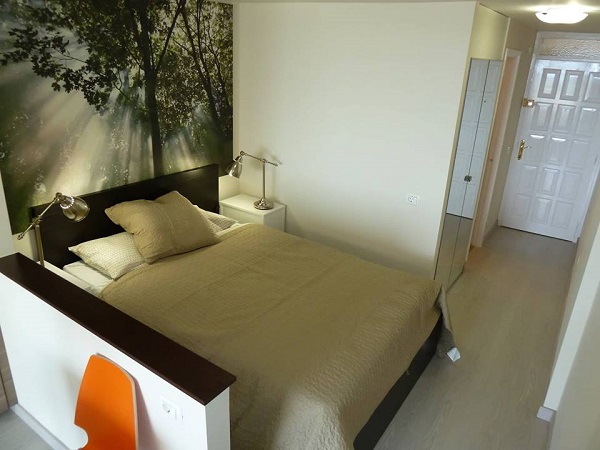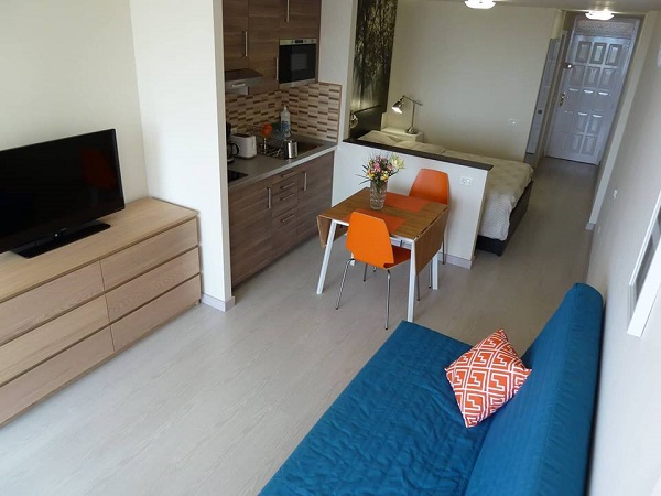 The chic living room has a nice sofa bed for 2 persons and a flat-screen TV, the bedroom is with a comfortable double bed. The kitchen equipped with oven, refrigerator, coffee-maker, toaster, washing machine. The bathroom is with shower.